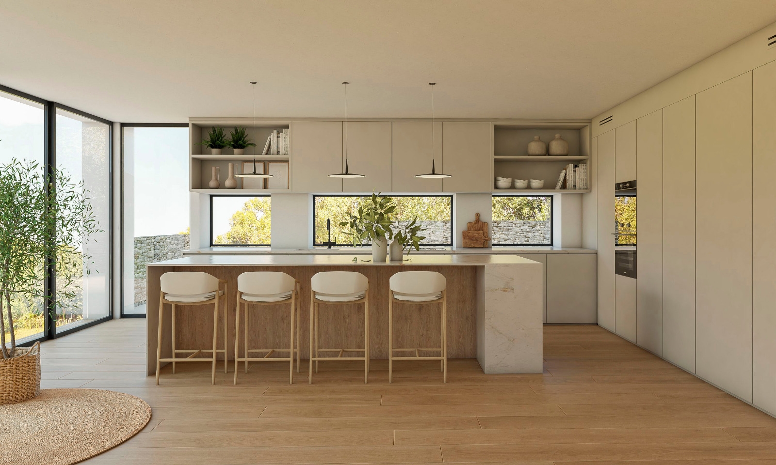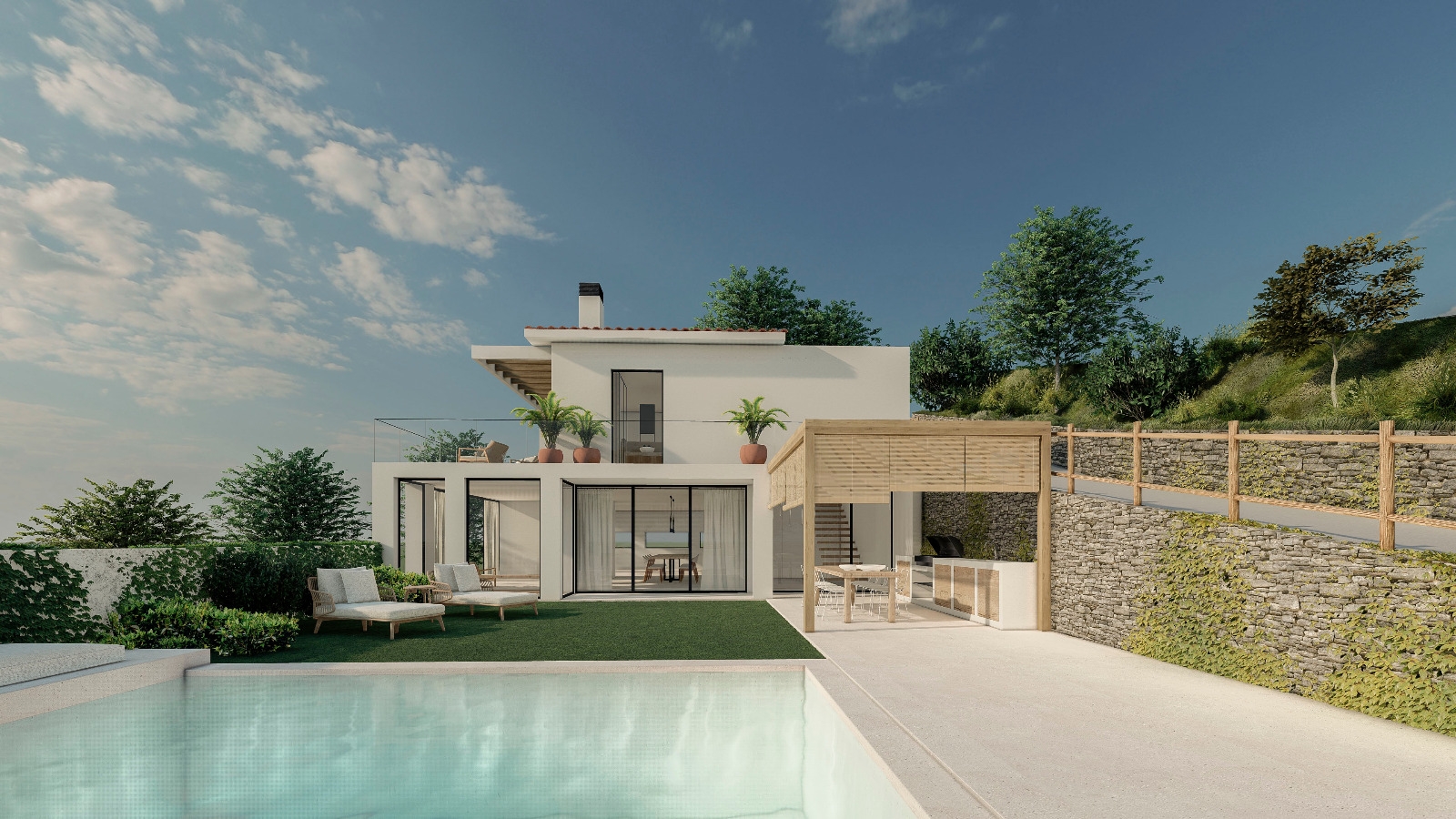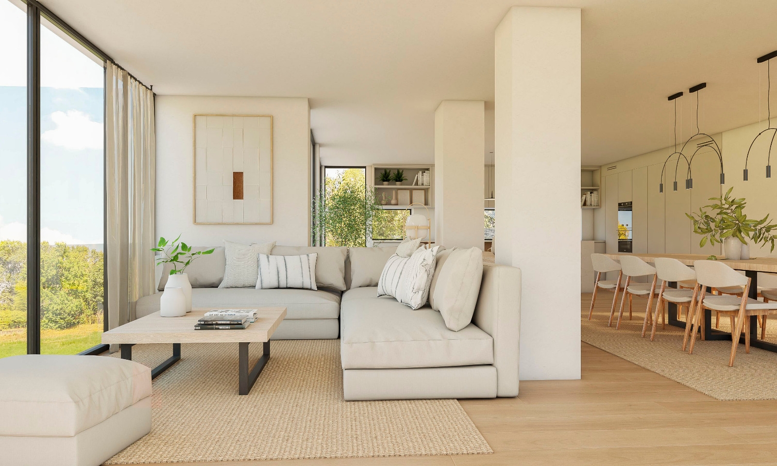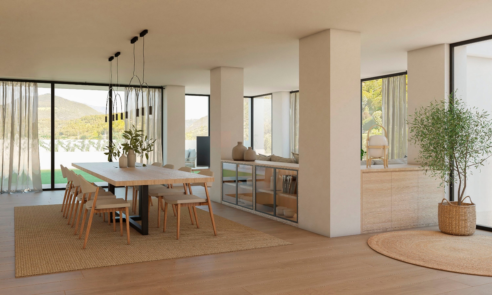 El salón comedor es un espacio amplio y luminoso, gracias a sus grandes ventanales que ofrecen vistas al jardín y a la piscina. Desde aquí, se accede a una gran terraza con vistas despejadas, perfecta para relajarse o compartir momentos con amigos y familiares. La cocina, totalmente equipada y de gran tamaño, es un sueño para cualquier amante de la gastronomía.